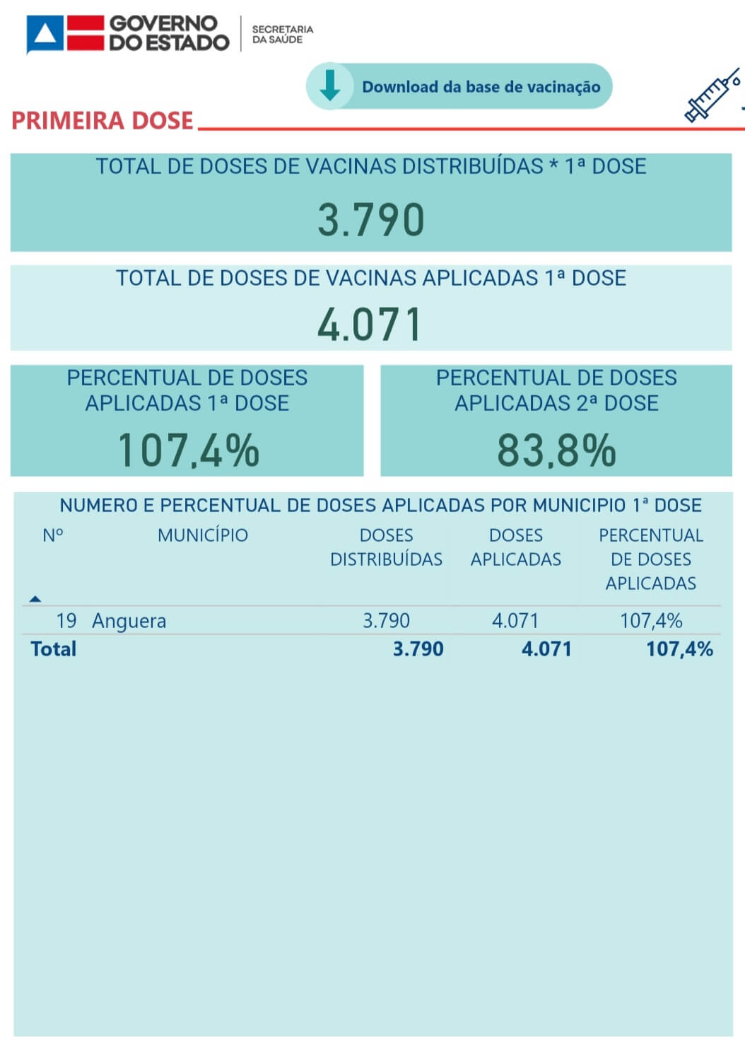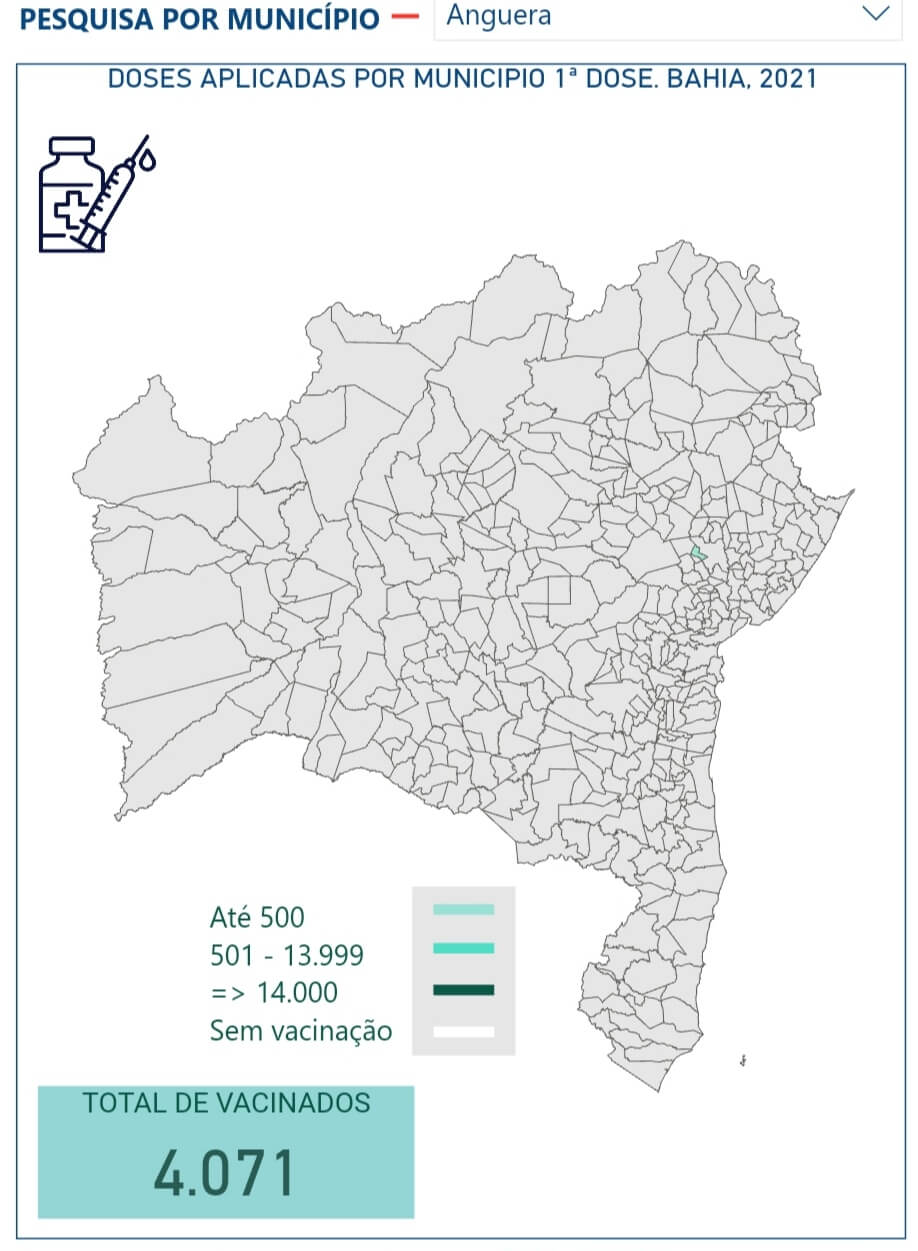 O município de Anguera já recebeu 3.790 doses de vacinas contra o COVID-19 para o programa de imunização, as doses aplicadas alcançam o número de 4.071 entre a primeira e a segunda dose.