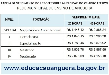 Como incentivo aos professores municipais no sentido de acompanhamento seus vencimentos em contracheque, a Secretaria Municipal de Educação está divulgando a tabela de vencimentos do quadro docente efetivo.