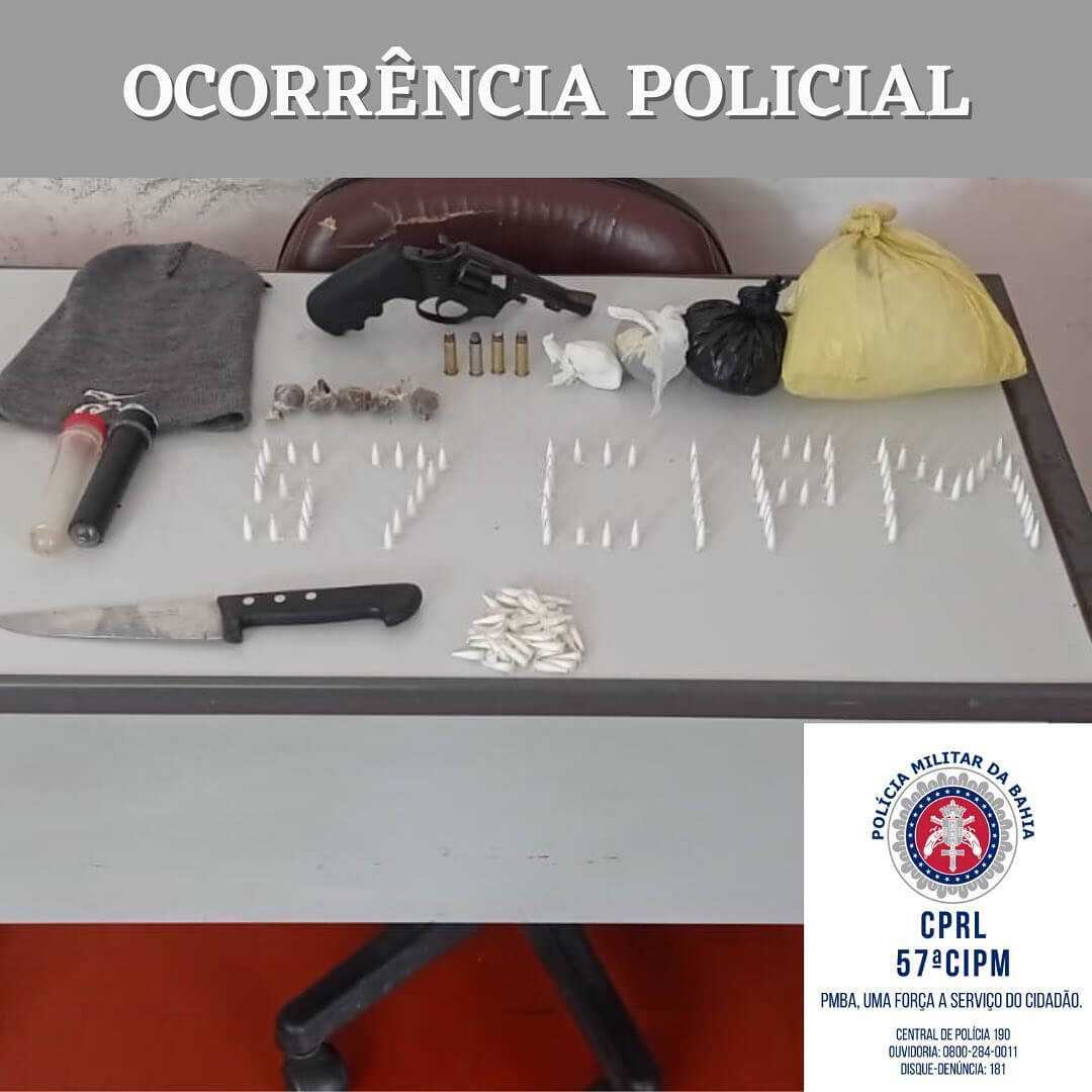 Na manhã de ontem (26), após receber denúncia de tráfico de drogas, a Polícia Militar iniciou diligências na Rua Pedro Mendes, esquina da Rua A, no centro de Anguera, quando avistaram dois homens correndo e pulando o muro de uma das casas, um deles com uma arma de fogo nas mãos. Em ato contínuo, iniciaram a perseguição conseguindo deter os dois homens e apreender um revólver calibre 38 municiado, uma certa quantidade de drogas, microtubos e uma faca.