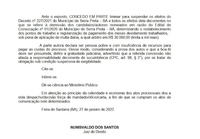 No dia de ontem(27), a Justiça da Bahia, representada pelo Juiz de Direito Nunisvaldo dos Santos concedeu liminar para suspender os efeitos do Decreto nº 227/2021 do Município de Serra Preta – BA e todos os efeitos dele decorrentes no que se refere à demissão dos candidatos nomeados para o cargo de Guarda Civil Municipal em razão do Edital de Convocação nº 01/2020 do município de Serra Preta – BA, determinando o restabelecimento dos postos de trabalho e regularização do pagamento dos meses devidamente trabalhados, sob pena de aplicação de multa diária, o qual arbitrou em R$ 30.000,00 (trinta a mil reais), suspendendo desta forma o processo administrativo da Prefeitura de Serra Preta que excluiu os guardas municipais.
