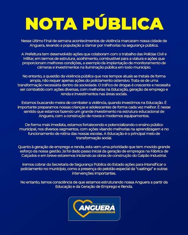 Nesse último final de semana acontecimentos de violência marcaram nossa cidade de Anguera, levando a população a clamar por melhorias na segurança pública.