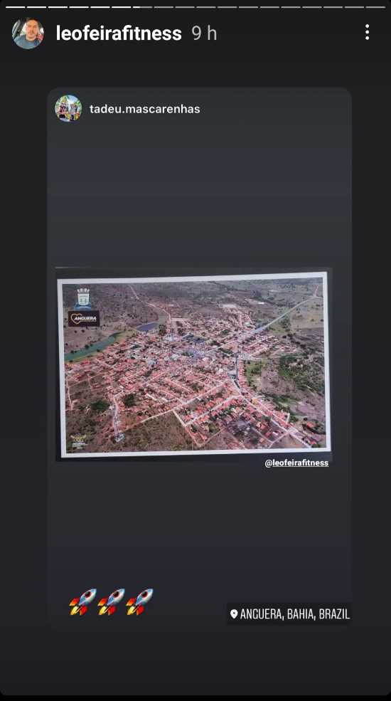 Outra foto postada no story do empresário também nos chamou a atenção: uma imagem aérea da cidade de Anguera com as imagens de três Emoji em forma de foguete que na linguagem dos internautas significa "pra cima", "aceleração", "velocidade rápida", ...