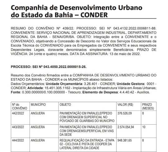 Convênio firmado entre a Companhia de Desenvolvimento Urbano do Estado da Bahia com o município de Anguera irá injetar R$ 3.898.962,68 na pavimentação em paralelepípedo com drenagem superficial em vias da cidade (sede) e do povoado de Guaribas, como também na requalificação da entrada da cidade (ciclovia e pista de cooper). Publicado hoje (17) no Diário Oficial do Estado, as obras terão prazos para sua conclusão: na sede, prazo de 10 meses; no povoado de Guaribas, prazo de 8 meses e requalificação da entrada da cidade, prazo de 8 meses.