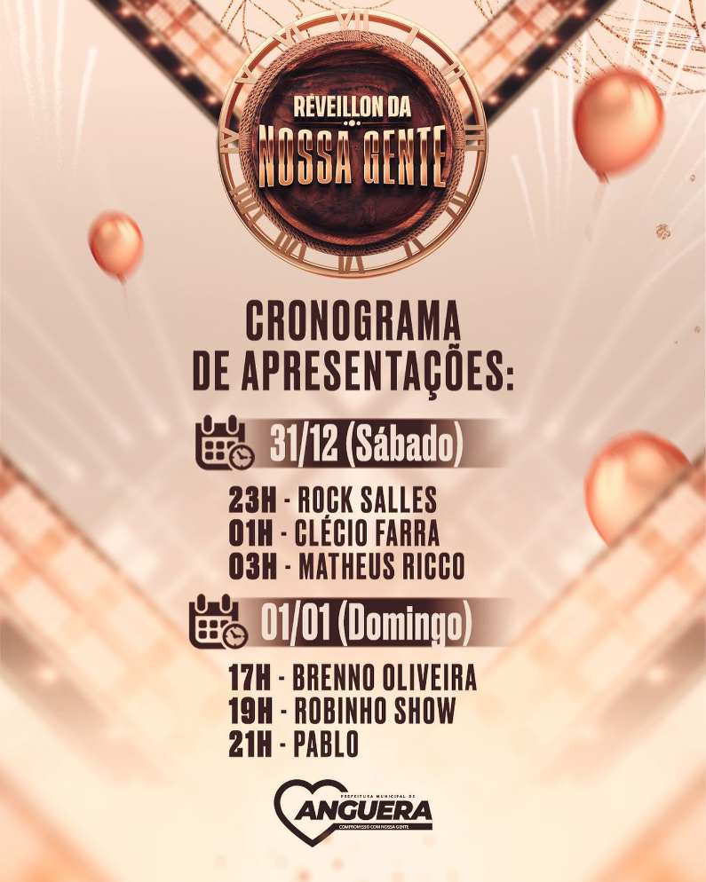 Hoje(31) e amanhã(1º) o prefeito Mauro Vieira já garantiu para os anguerenses e os visitantes que irão passar a virada de ano na cidade, uma grade de atrações com vários músicos. Veja o cronograma de apresentações do “RÉVEILLON DA NOSSA GENTE”: