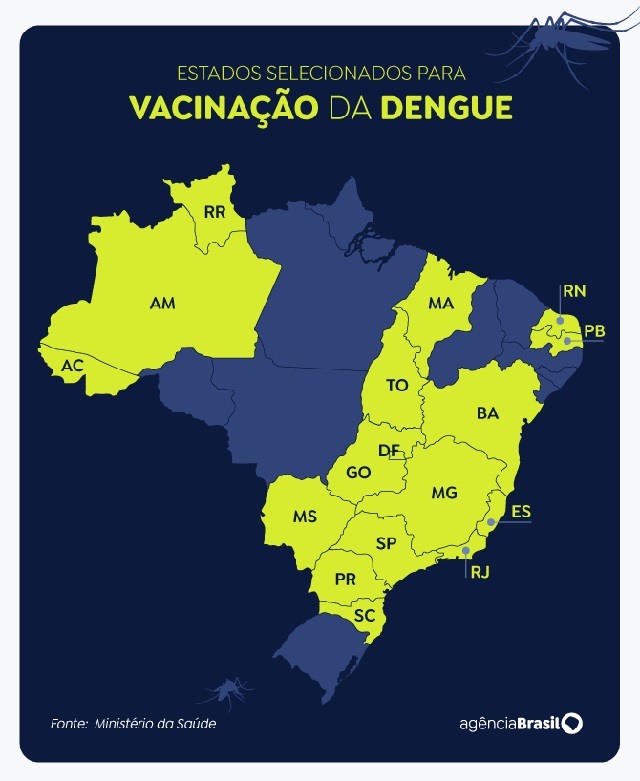 Agência Brasil – O Ministério da Saúde informou que 521 municípios de 17 estados brasileiros foram selecionados para iniciar a vacinação contra a dengue via Sistema Único de Saúde (SUS) a partir de fevereiro. As cidades compõem um total de 37 regiões de saúde que, segundo a pasta, são consideradas endêmicas para a doença. Na Bahia 115 municípios foram contemplados.