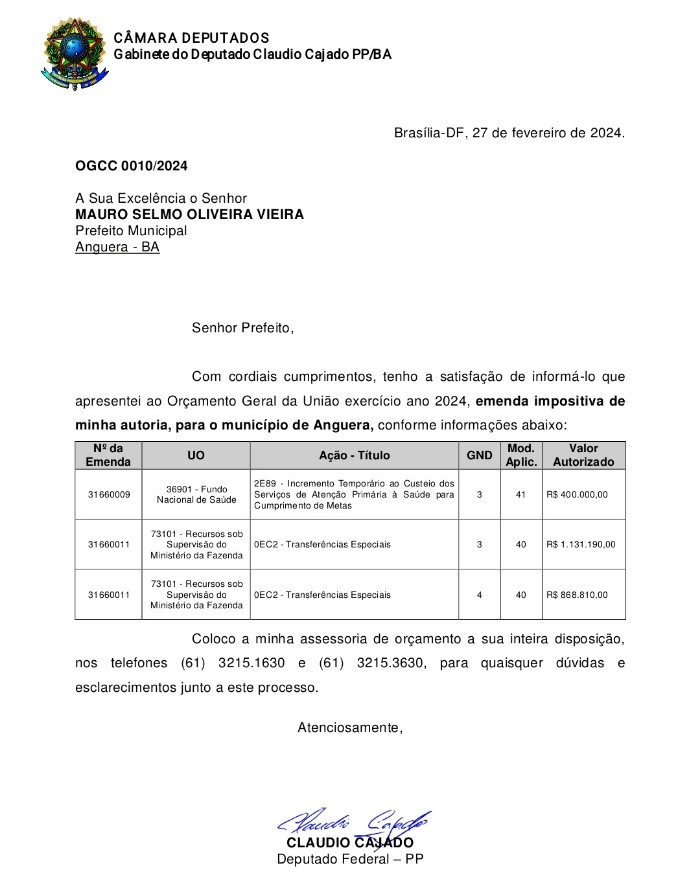 Com essa nova emenda impositiva, Cláudio Cajado reafirma seu compromisso com o desenvolvimento de Anguera, evidenciando sua parceria política com o prefeito Mauro Vieira. A expectativa é de que esses recursos tragam melhorias significativas para a cidade e beneficiem diretamente os cidadãos.