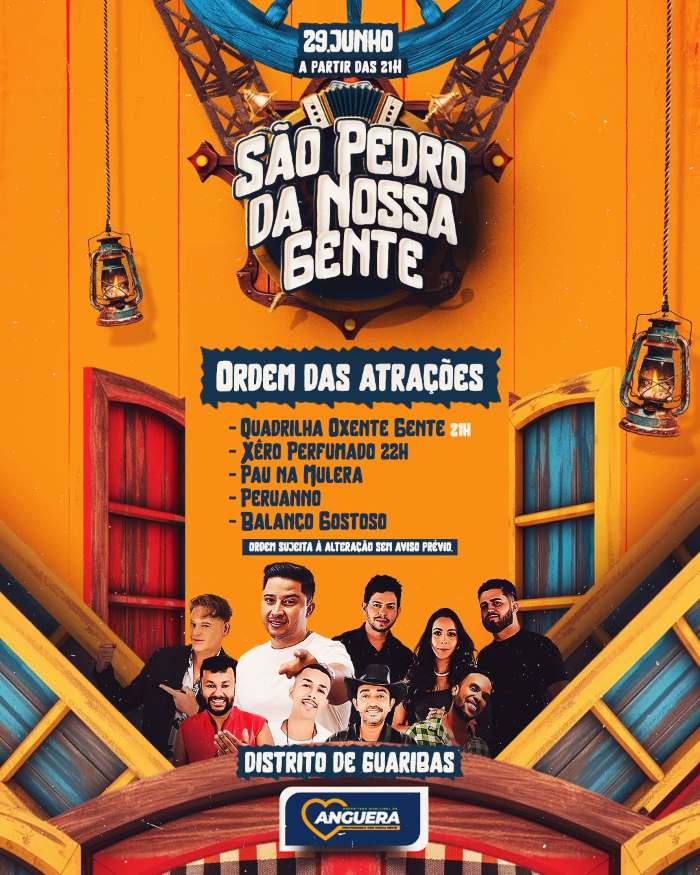 A Prefeitura Municipal de Anguera realizará neste sábado (29), o evento "São Pedro da Nossa Gente" no Povoado de Guaribas, localizado na zona rural do município. O evento contará com uma diversificada grade de atrações, conforme informado no cartaz divulgado pela prefeitura.