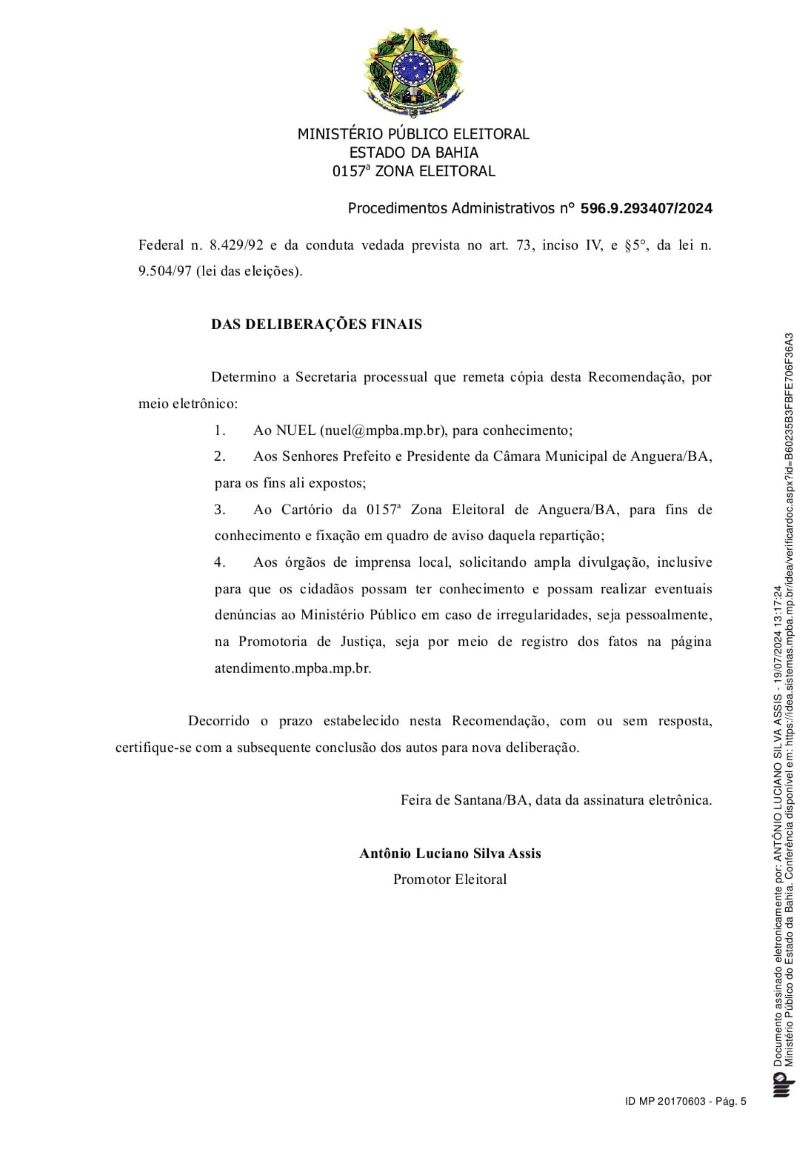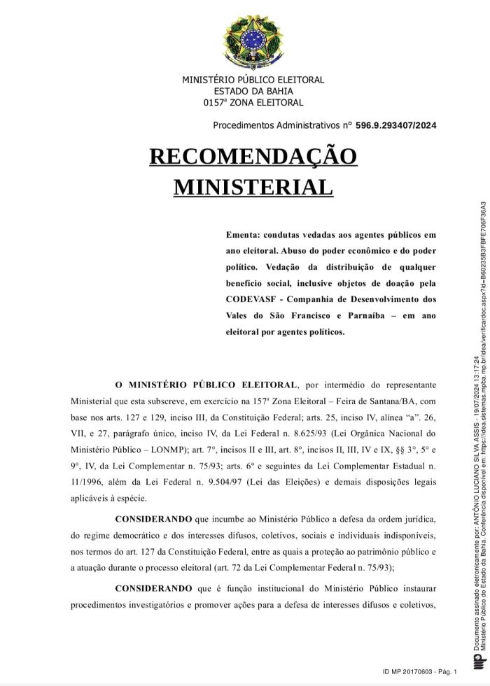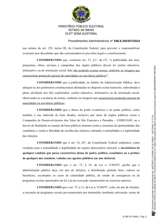 “Segundo a Constituição Federal, a publicidade dos atos, programas, obras, serviços e campanhas dos órgãos públicos deverá ter caráter educativo, informativo ou de orientação social, não podendo constar nomes, símbolos ou imagens que caracterizem promoção pessoal de autoridades ou servidores públicos”, ressaltou. Desde o início de julho, o MPE intensificou o acompanhamento dos termos de doação firmados pela Codevasf com o Poder Executivo ou entidades do terceiro setor em diversos municípios baianos. A atuação é relativa aos termos que serão efetivados no período eleitoral.