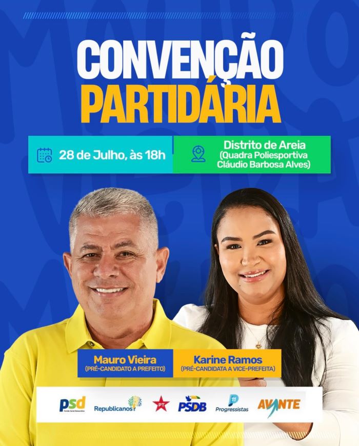 No dia 28 de julho, o município de Anguera será palco de um importante acontecimento político: a Convenção Partidária do bloco formado por PSD, Republicanos10, PT, PSDB, Progressista e Avante, que apresentará seus candidatos para as eleições municipais deste ano. O evento ocorrerá às 18 horas, na quadra poliesportiva do Distrito de Areia.