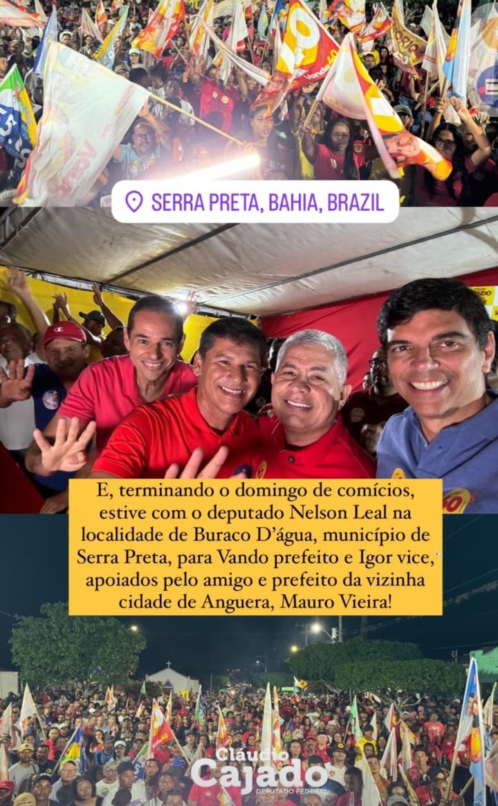 O último domingo foi marcado por forte mobilização política no município de Serra Preta, com o prefeito de Anguera e candidato à reeleição, Mauro Vieira, assumindo papel de protagonista nos eventos da campanha. Acompanhado dos deputados Nelson Leal e Cláudio Cajado, Mauro esteve presente nos comícios do candidato a prefeito Vando Figueredo, do PSB 40, demonstrando um significativo apoio político e reforçando a confiança na eventual vitória de Vando.