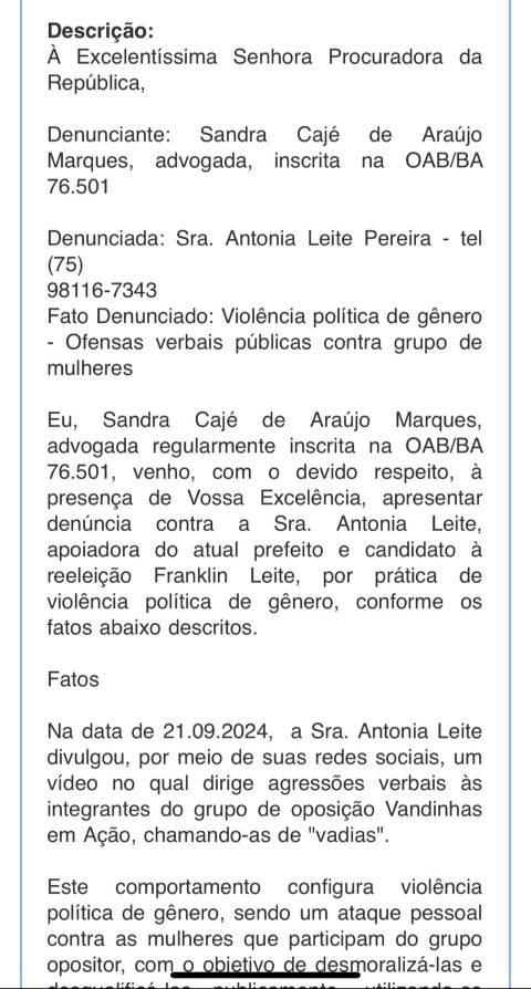 Na última semana, um episódio lamentável envolvendo a apoiadora do atual prefeito e candidato à reeleição, Franklin Leite, Sra. Antonia Leite, causou indignação em Serra Preta. Em um vídeo publicado em suas redes sociais, a Sra. Antonia, que é moradora da sede de Serra Preta e esposa do ex-administrador da localidade, ofendeu as mulheres do grupo de oposição denominado "Vandinhas em Ação", chamando-as de “vadias”.