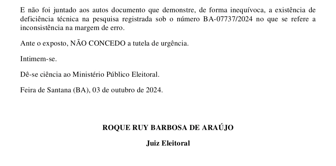 Em uma decisão que reafirma a integridade das pesquisas eleitorais na cidade, a Justiça negou, pela segunda vez, um pedido de liminar que tentava desqualificar a pesquisa do Grupo do 40, a qual apresenta Vando Figueredo liderando com 53,9% dos votos válidos. O juiz responsável pelo caso, ao analisar os argumentos apresentados pelos partidos contrários à coligação, destacou a ausência de inconsistências técnicas na pesquisa, mantendo a tutela de urgência não concedida.