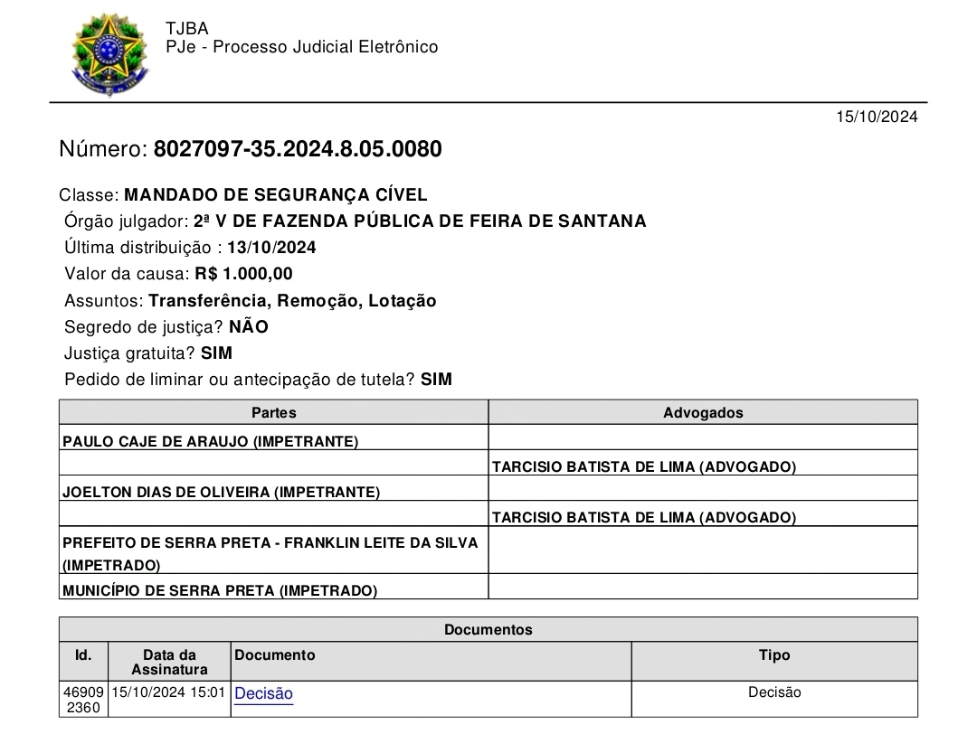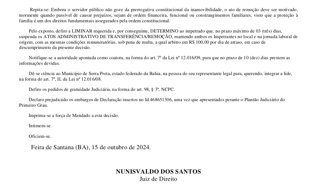 O juiz da comarca de Serra Preta, no estado da Bahia, emitiu uma decisão favorável a dois guardas municipais que haviam sido transferidos de forma considerada irregular. Franklin Leite, prefeito da cidade, foi notificado para suspender os atos administrativos de transferência e garantir que os servidores Paulo Cajé de Araújo e Joelton Dias de Oliveira retornem aos seus postos originais, mantendo a jornada laboral e as condições remuneratórias anteriores.