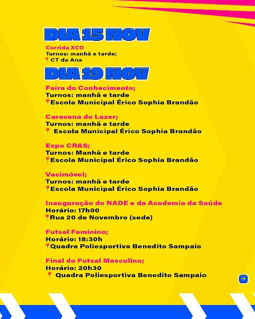 As comemorações começam neste sábado, 15 de novembro, e seguem nos dias 19 e 20, com eventos pensados para valorizar a história e a identidade do município. Entre os destaques estão a presença do Vacimóvel, que levará serviços de imunização à população, e a Caravana do Lazer, oferecendo atividades recreativas para todas as idades.