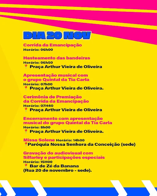 No esporte, haverá torneios de futsal masculino e feminino, além da tradicional Corrida da Emancipação, marcada para o dia 20. A programação cultural também promete animar os moradores: a banda Quintal da Tia Carla fará apresentações durante os festejos, e uma missa solene será celebrada na Paróquia Nossa Senhora da Conceição. Para encerrar com chave de ouro, o cantor Silfarley realizará a gravação de um audiovisual na cidade.